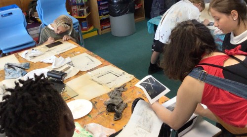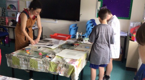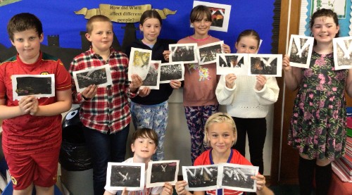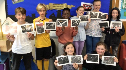 In Class 3 we have been incredibly lucky to have local artist and our school Director for Creative Arts, Eleanor Russell – Hsieh, support us with our printing work. We used the technique of monoprinting to create spectacular ‘Blitz scene’ silhouettes. We rolled black ink evenly onto a Perspex sheet and experimented with different tools to create building outlines, colour to create drama and even talcum powder to add interest and texture.