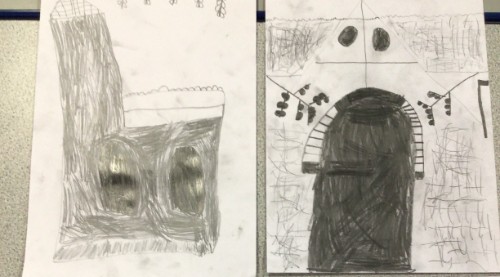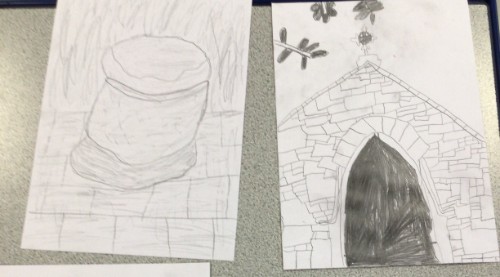 The children took their sketchbooks to the church and tried observing the shapes they could see. They sketched part of the church within their books.