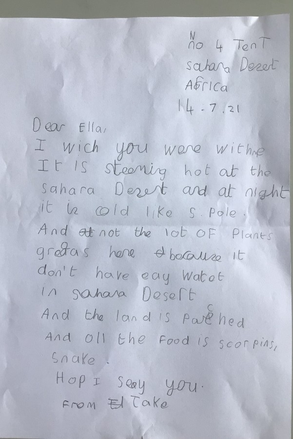 We are so proud of Jake's writing today. He has written a letter from the Sahara Desert to his friend Ella. He did this totally independently and has showed amazing progress this year. Well done Jake