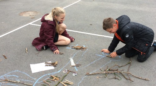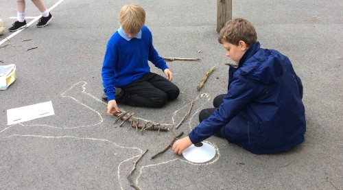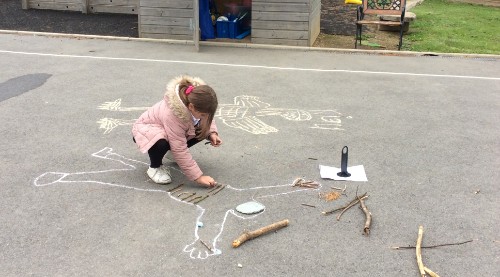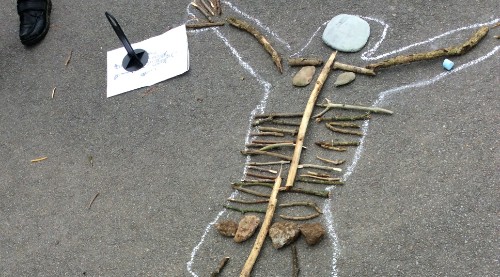 Mrs Dunn's 'Bubble' have been busy learning about the human skeleton and have been creating their our skeletons by using any objects they can find around the playground. Mrs Dunn has been making sure the correct number of ribs have been added and everything was in the right place!