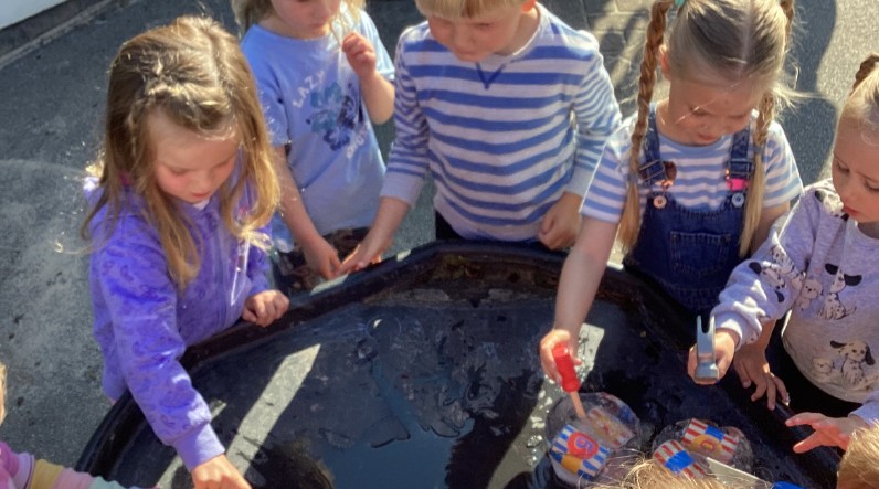 With the unseasonably warm weather, Preschool had a nice cooling activity today. Items were frozen inside blocks of ice, the children then used hammers and picks to dig out the items inside. Once they had completed the activity the children requested sponges so they could wash the cars and tractors. A lovely day in the sun!