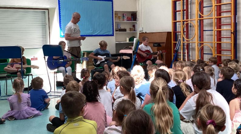 During Collective Worship today, we were treated to an end of year performance by our talented guitarists Jago, William, Rosie, and Kensa. They strummed along to Olivia Rodrigo, The Beach Boys, and the Harry Potter Theme.